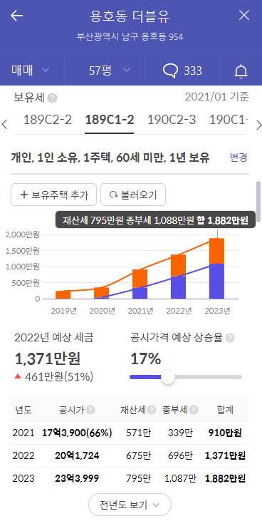 또 아래로 내리시면 이 주택을 보유할 시 들어가게 되는 보유세 및 종부세 등을 알 수 있으나 참고용으로만 사용하시면 좋을 것 같습니다.