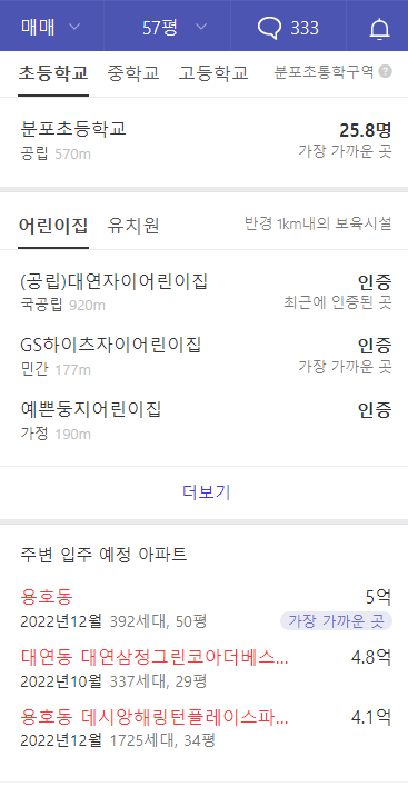 그리고 이제 마지막으로 학교 및 보육시설을 볼 수 있고 주변 입주 예정 아파트 또한 볼 수 있습니다.