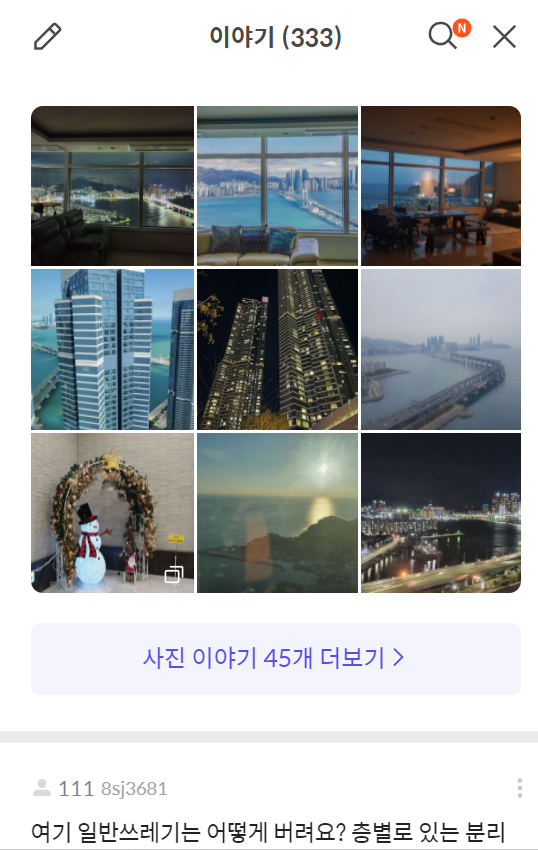 그리고 오른쪽 대화칸을 선택하시면 아래와 같이 아파트 입주민이라던지 외지인이 궁금한 점 or 장점 등 다양한 커뮤니티 기능을 형성하고 있으니 참고해보시면 좋습니다.